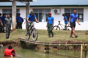 Kemudian, para prajurit menunjukkan ketangkasan mereka dengan melewati kolam menggunakan sepeda. Medan yang licin dan berat tidak menyurutkan semangat mereka untuk mencapai garis finish dengan cepat dan aman.