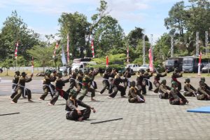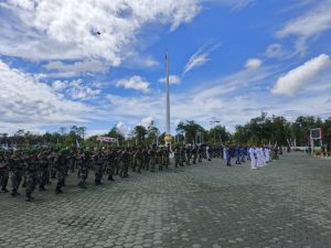 Prajurit Yonif 754/ENK turut dalam Upacara Memperingati Hari Ulang Tahun ke-80 TNI pada hari Minggu (05/10/2025) di Kantor Pemerintahan Daerah Timika (Timika, Papua Tengah)