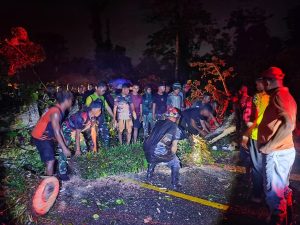 Sebanyak 30 prajurit Brigif 20/IJK/3 Kostrad bergerak cepat membantu menyingkirkan pohon tumbang yang menghalangi badan jalan di area Jalan Poros Mapuru Jaya KM 12, RT 12 Kampung Kadun Jaya, Kecamatan Wania, Provinsi Papua Tengah, pada Sabtu, 15 November 2025 sekitar pukul 18.30 WIT. Kejadian tersebut sempat menyebabkan kemacetan dan antrean kendaraan di kedua arah.